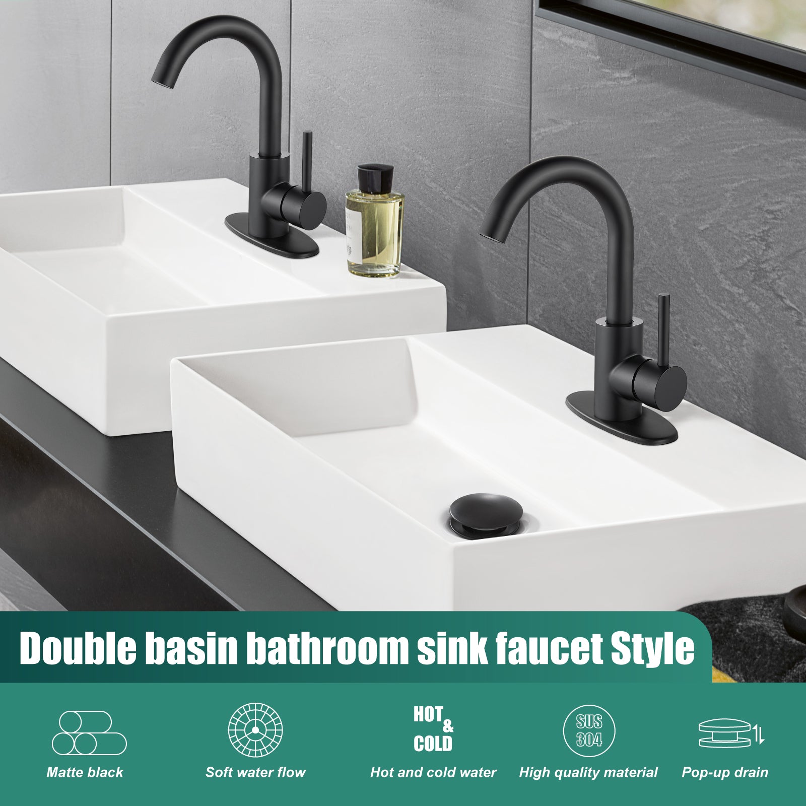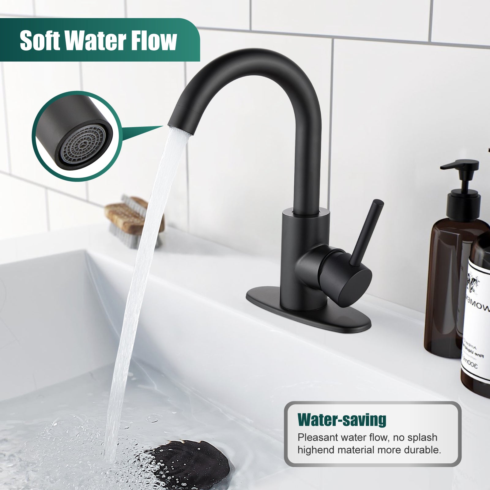 【Unique Design】:The matte black single handle bathroom faucet is suitable for any contemporary decorating style. The simple and smooth gooseneck lines of the faucet add beauty and elegance to the kitchen or bathroom, while also preventing water splashing.