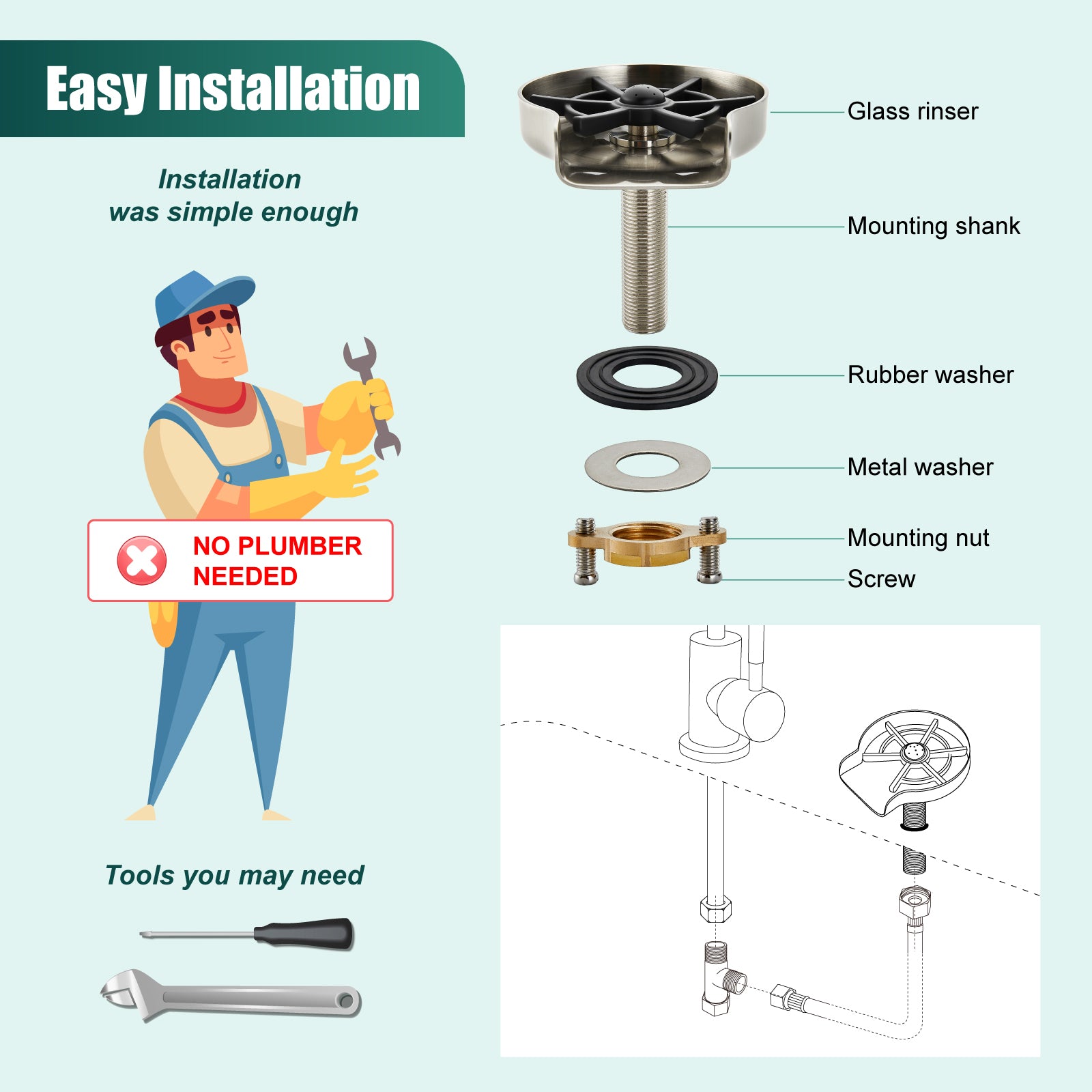 [Simple to Install] Simply installed in an empty countertop hole, such as those used for soap dispensers and sink sprayers. It only takes several minutes to install our glass rinser all by yourself.