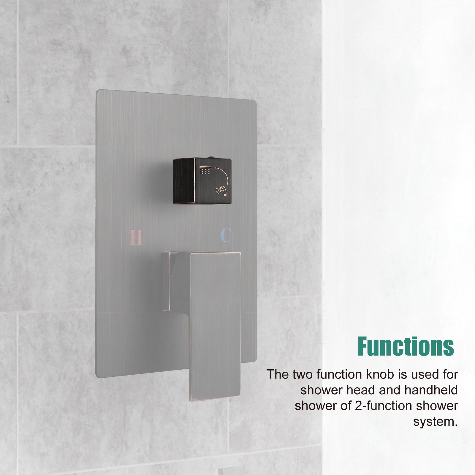 【Functions】: The two function knob is used for shower head and handheld shower of 2-function shower system.